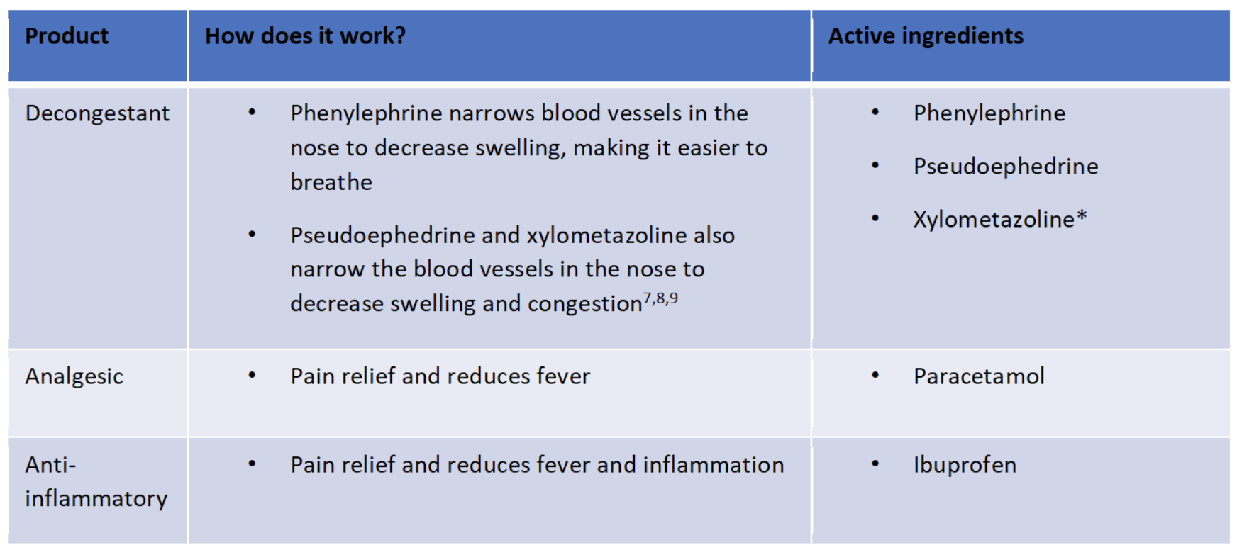• Over-the-counter products are available as single ingredient products or as combination ‘all-in-one’ remedies. They are available as tablets, capsules, nasal sprays and liquids. Patients should be reminded to take only one medicine with the same type of active ingredient at a time.