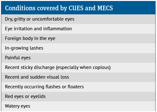 CUES services are delivered by optometrists who will manage the treatment themselves or make referrals as needed. Based on symptoms, the MECS optometrist service will arrange a phone, video or in-person consultation, typically within 24 hours or a few working days. For mild cases, MECS may advise patients to consult a pharmacist instead.