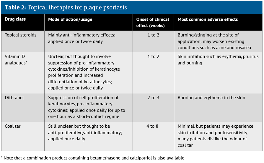 There are a number of topical agents available and a summary of these agents, their onset of action and main adverse effects are summarised in Table 2, below.