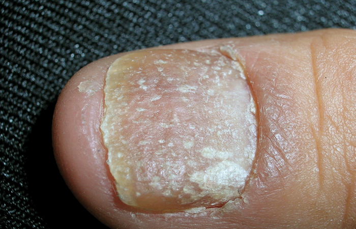 Often, patients with psoriasis experience changes to their nails, including abnormal nail plate growth, leading to characteristic pitting, a build-up of keratinous material underneath the nail (subungual hyperkeratosis) and detachment of the nail from its bed (onycholysis).