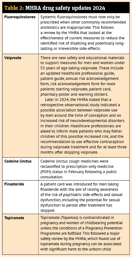 The Medicines and Healthcare products Regulatory Agency (MHRA) issued drug safety updates throughout 2024. Table 2 summarises key updates relevant to community pharmacy.