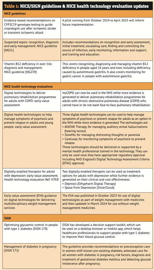 Table 1 (below) summarises the guideline and health technology evaluation updates relevant to community pharmacy. This year saw a new appraisal of the impact of testing for CYP2C19 to guide the prescribing of clopidogrel before starting or in the initial phase of treatment.
