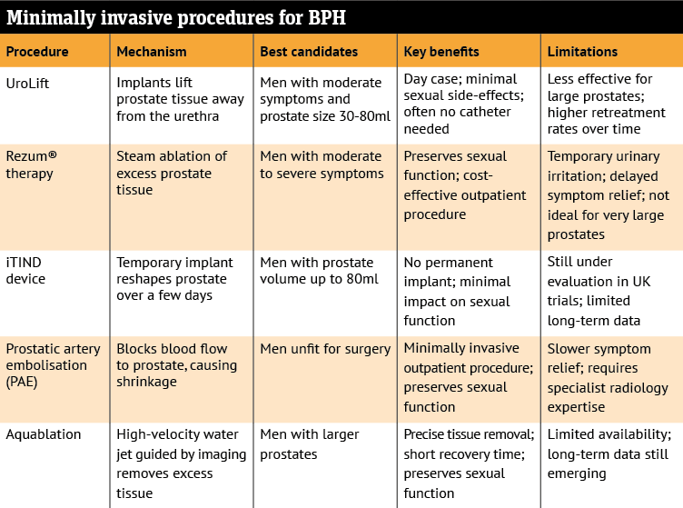 In addition, there are so-called ‘minimally invasive’ procedures for the treatment of BPH. For men experiencing urinary symptoms caused by an enlarged prostate, several treatment options are available that are less invasive than traditional surgery.