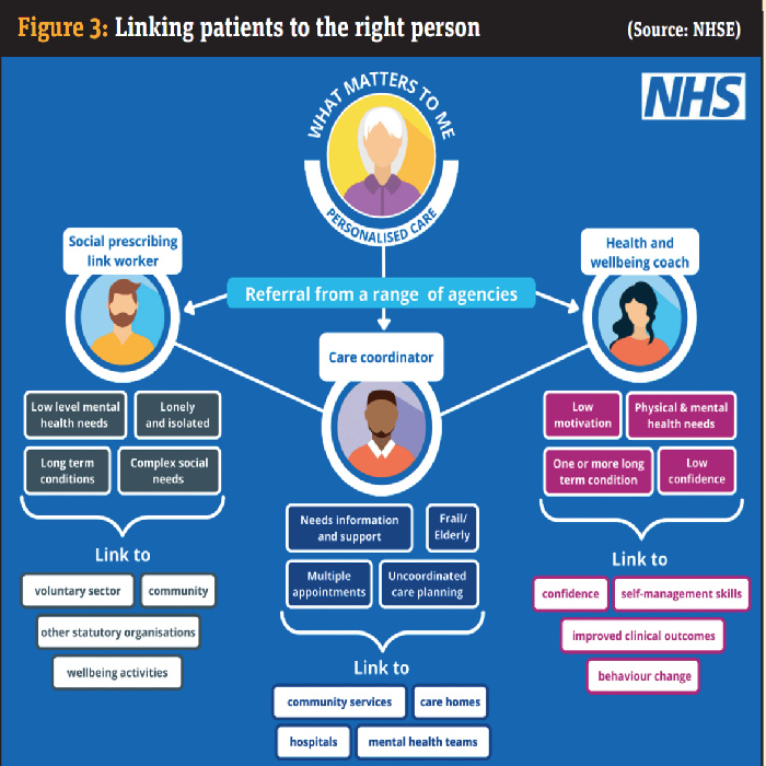 Service specifications within essential services for public health, signposting, support for self-care and healthy living pharmacies provide opportunities to improve patient knowledge and empowerment. These activities do fulfil some aspects of social prescribing (e.g. helping or directing people to other agencies), but all require the patient to act independently.