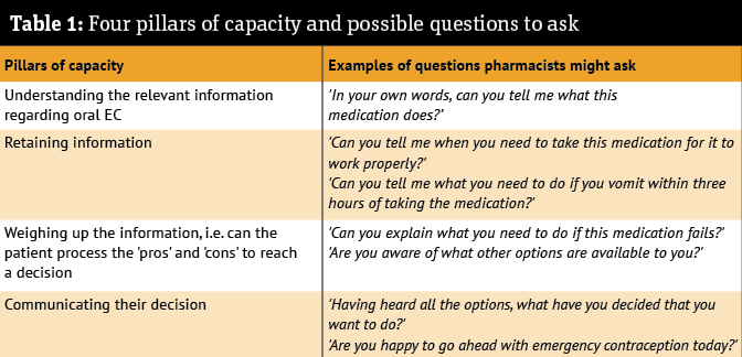 The four key pillars of capacity are shown in Table 1 (below), along with examples of questions a pharmacist might ask as part of an assessment. Nevertheless, it is essential to recognise that capacity is context- and decision-specific. In other words, someone might have the capacity to decide where they want to live, or what they would like to eat, but lack the capacity to make decisions over their medication.