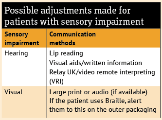 When providing oral EC to patients with sensory impairments, pharmacists should communicate directly and ask how they prefer to receive information. Practical guidance is outlined in the box below and the Pharmacy Magazine CPD module on 'Adjusting consultations in sensory impairment' (August) can be referred to for additional detail.
