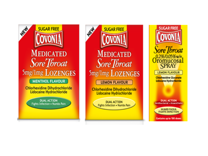 NEW Covonia Medicated Sore Throat 5mg/1mg Lozenges have a dual action formula that numbs pain (lidocaine hydrochloride) and fights infection (chlorhexidine dihydrochloride). The lozenges are sugar-free and suitable for people with diabetes, vegetarians, vegans and coeliacs. Available in two flavours – lemon and menthol to provide soothing relief from sore throats.3
