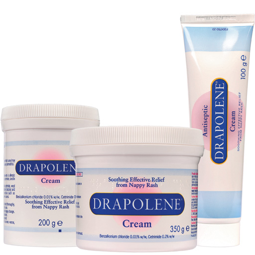 Drapolene Cream, for the treatment and prevention of nappy rash in babies, contains two antiseptics, benzalkonium chloride and cetrimide, which help prevent the growth of bacteria. The non-greasy cream also contains lanolin and white paraffin to moisturise and protect the skin. Drapolene can be used at every nappy change and to treat urinary dermatitis in adults and at any age to treat minor burns.