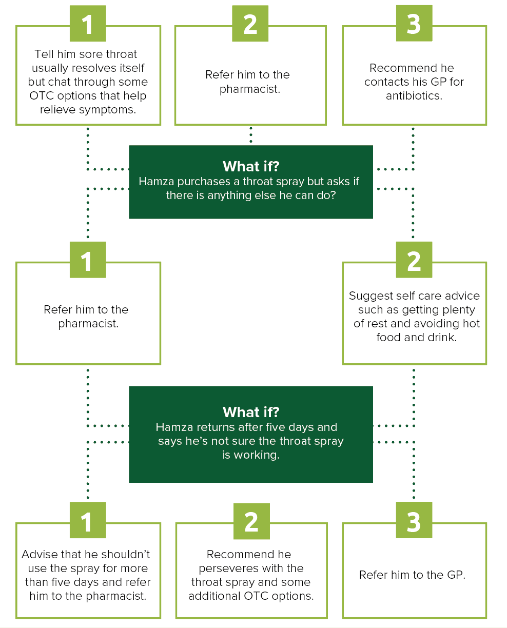 Hamza comes in the pharmacy complaining of a sore throat and asks for your advice on the counter.