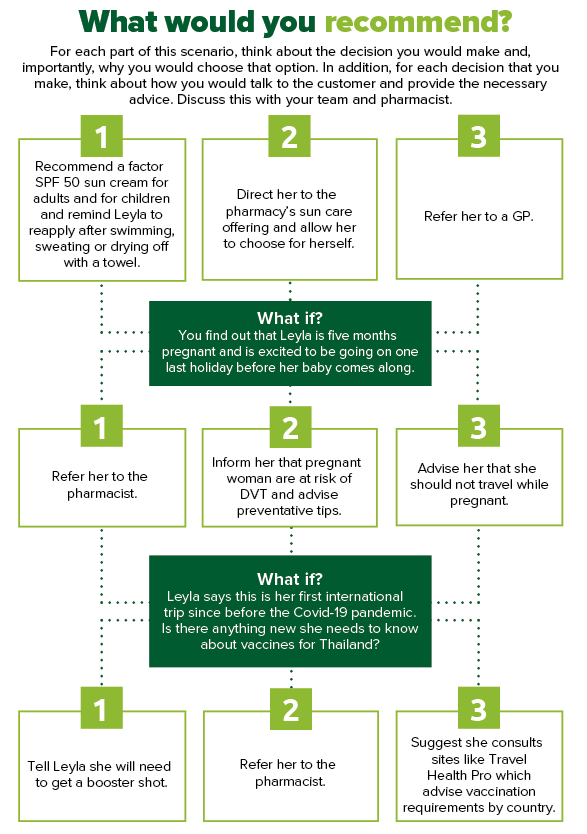 Leyla, 32, comes into the pharmacy asking for advice for her summer holiday. She is going to Thailand and is looking to purchase sun cream for her and her family.