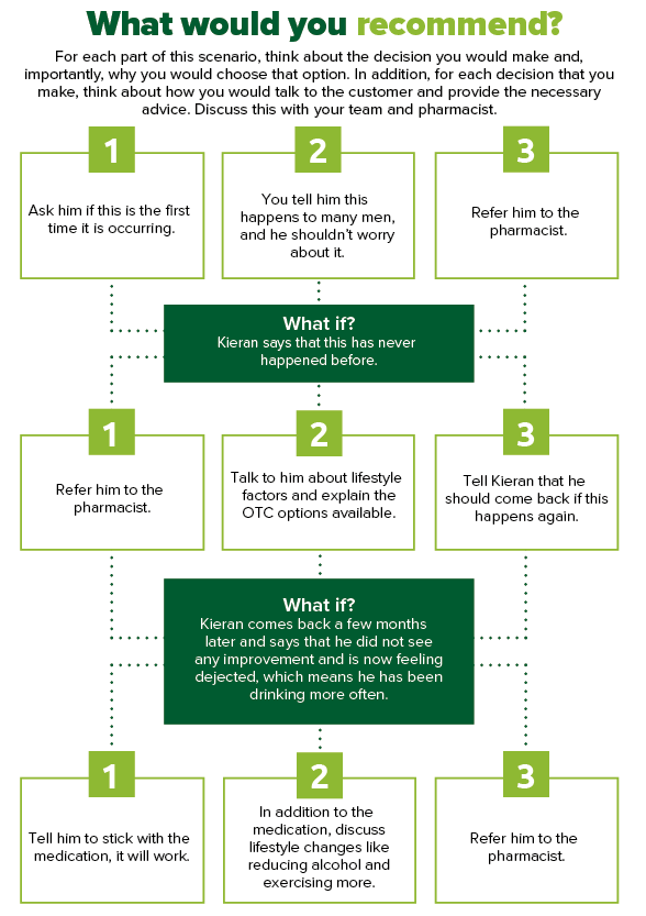 Kieran comes into the pharmacy and says he needs advice as he is having trouble maintaining an erection.