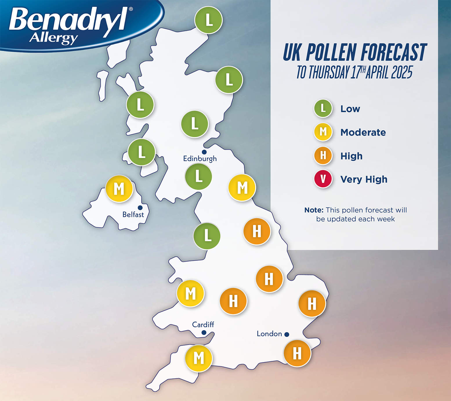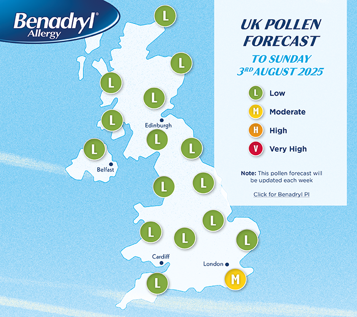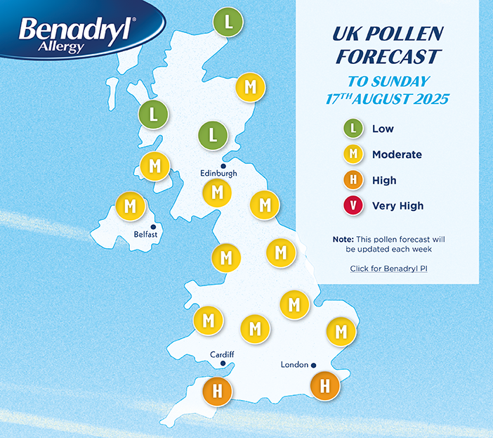 This pollen forecast is created using information from the Met Office weather data combined with data organisations such as the National Pollen and Aerobiological Unit.