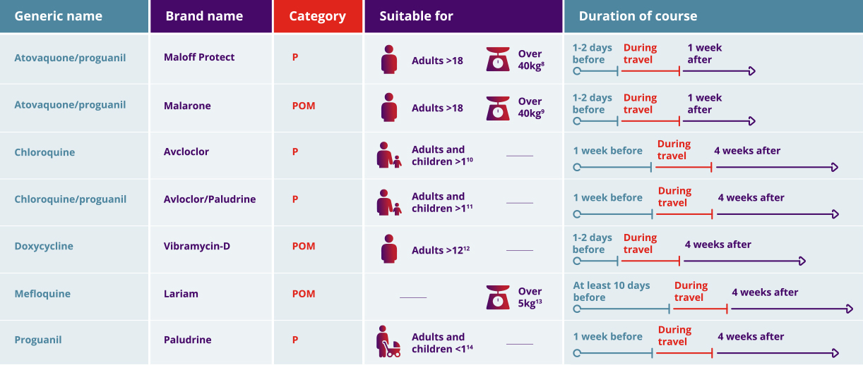 Selecting the right antimalarial depends on the region(s) the customer intends to travel to and the prevalence of resistance to antimalarial drugs in those regions. The table below shows some of the common options available.