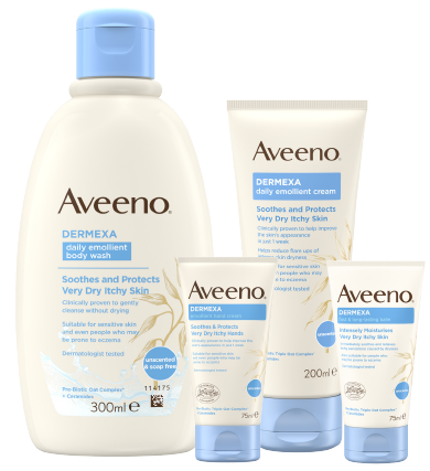 The AVEENO® Dermexa range formulated with oat complex (flour and extract) and ceramides helps to soothe dry itchy skin, strengthen the skin's moisture barrier and helps re-balance the skin microbiome.