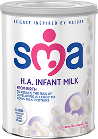 SMA H.A. Infant Milk should not be used if a baby has already been diagnosed with, or is suspected of already having, an allergy to cows’ milk protein.