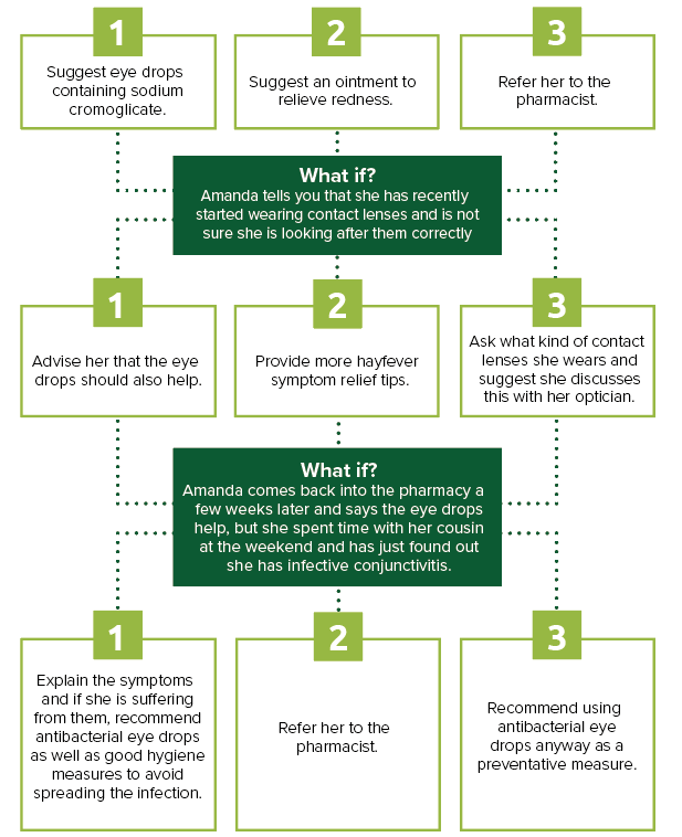 Amanda, 20, comes into the pharmacy looking for some advice. Her eyes have been feeling itchy and sore. She is looking for some symptom relief and has heard eye drops might be her best bet. She suffers from hayfever and takes tablets when necessary, her eyes are also noticeably red.