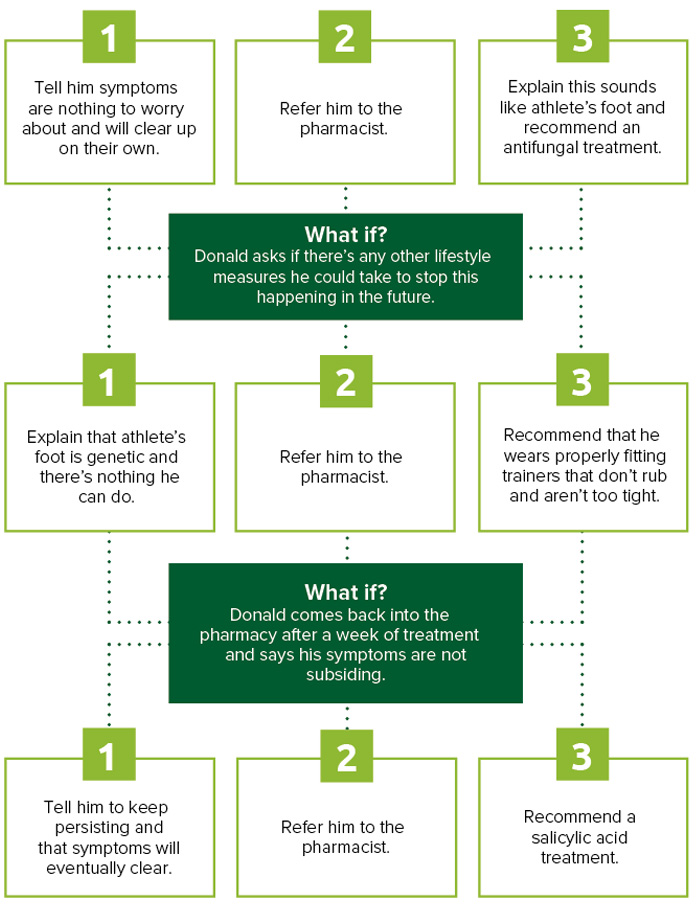 Donald, 40, comes into the pharmacy complaining about an irritated patch on his foot. He describes the skin between his fourth and fifth toe as red and itchy and tells you this developed after he recently completed a half marathon.