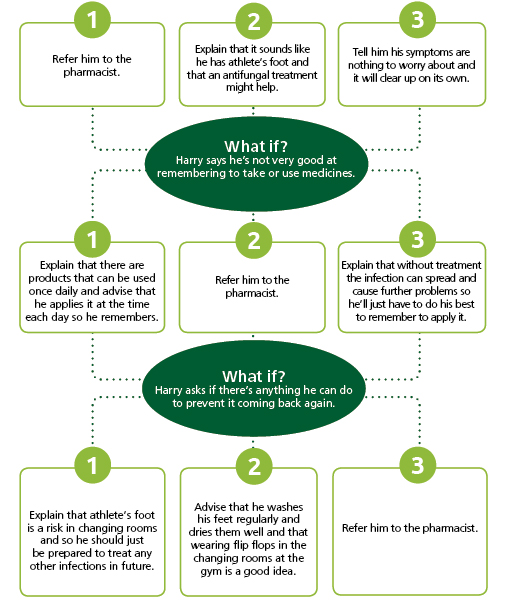 Harry comes into the pharmacy and asks for some advice about a problem on his foot. He describes the skin between his fourth and fifth toes as being red and itchy and tells you that he thinks it developed after a recent gym session.