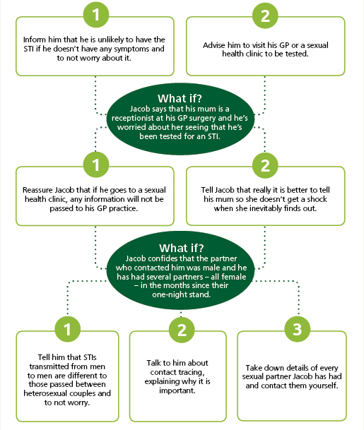 Jacob is in the pharmacy and asks for “a quiet word”. Once in the consultation room, he says that someone he slept with a few months ago has been in touch, advising him to get tested for chlamydia. Jacob says he feels fine, so wonders if he needs to bother.