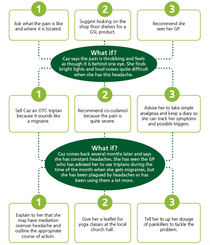 Regular customer Caz Wright, who is 46, comes into the pharmacy and says she has been suffering with headaches. She asks if there’s anything you can suggest as she’s really struggling.