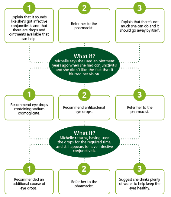 Michelle, aged 32, comes into the pharmacy for some advice as she has woken up with a red and swollen eyelid and the white of her eye is pink. She says there was also a lot of sticky, yellow discharge on her eyelashes, which she managed to soak off with warm water, but it doesn’t seem to be any better. She does not wear contact lenses.