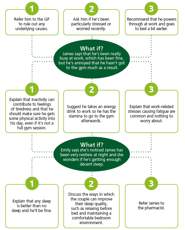 James comes into the pharmacy with his wife Emily. He looks a bit weary, so while they’re paying for their purchases, you ask if he’s feeling alright. He explains that generally he feels fine, but he has been really tired lately and is struggling to get through the day – he even fell asleep at his desk yesterday.