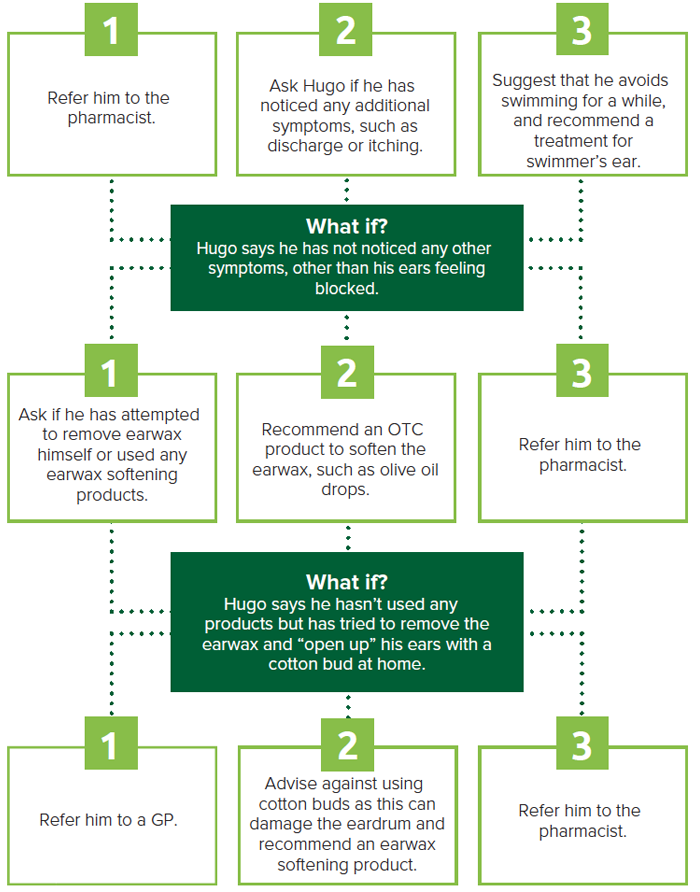 Hugo comes into the pharmacy complaining about his hearing. He has also noticed that his ears feel blocked. He is a keen swimmer, but uses earplugs when swimming to protect his ears, and also at night due to his partner’s snoring. He wonders if there’s anything he can do to improve his symptoms?